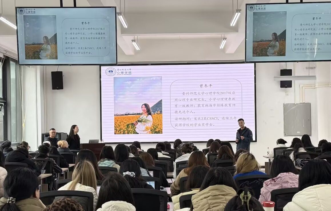 两位分享校友皆是心理学领域的优秀从业者与研究者,在各自赛道绽放光彩。张胜洪校友与心理学相伴相守27年,现任遵义师范学院心理学教授、应用心理专硕导师,更是贵州省“金师”荣誉获得者,他研发的“制药人意象技术”独树一帜,在艺术治疗领域成果丰硕;曾冬平校友作为我院应用心理专业优秀毕业生,现是小学心理健康教育一级教师,已发表两篇CSSCI论文,在中小学心理教育一线实践和学术科研探索中,交出了亮眼的答卷。