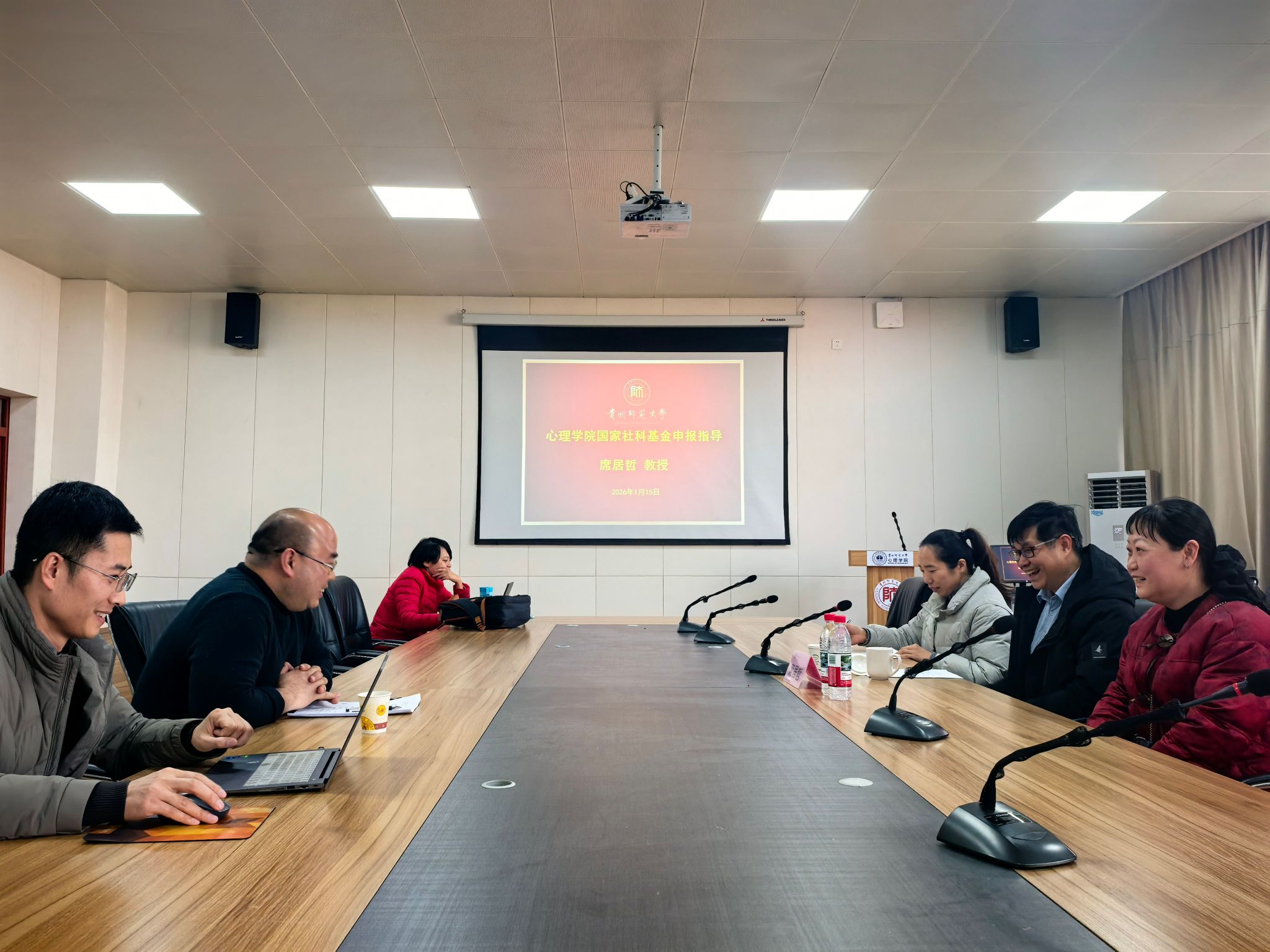 为切实提升我院教师国家社科基金项目申报质量,心理学院于1月15日下午组织开展了2026年度国家社科基金项目申报一对一辅导会。会议特邀华东师范大学心理与认知科学学院席居哲教授担任指导专家,我院教师罗杰、袁宜、桂丹阳、赵鹏娟、姚成奎参加辅导。